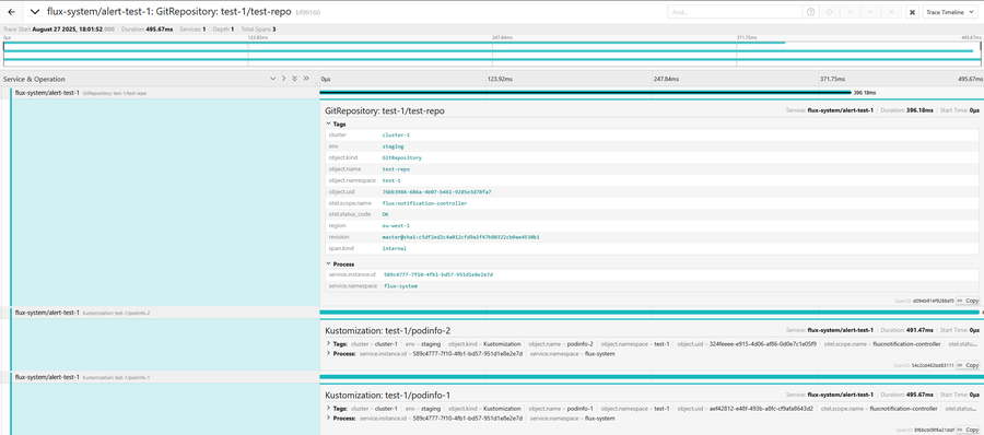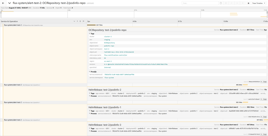 The notification-controller converts Flux events into OTEL spans with proper trace relationships based on the Flux object hierarchy. Source objects (GitRepository, HelmChart, OCIRepository, Bucket) create root spans, while Kustomization and HelmRelease objects create child spans within the same trace. Each span includes event metadata as attributes and uses the alert name and namespace as the service identifier.